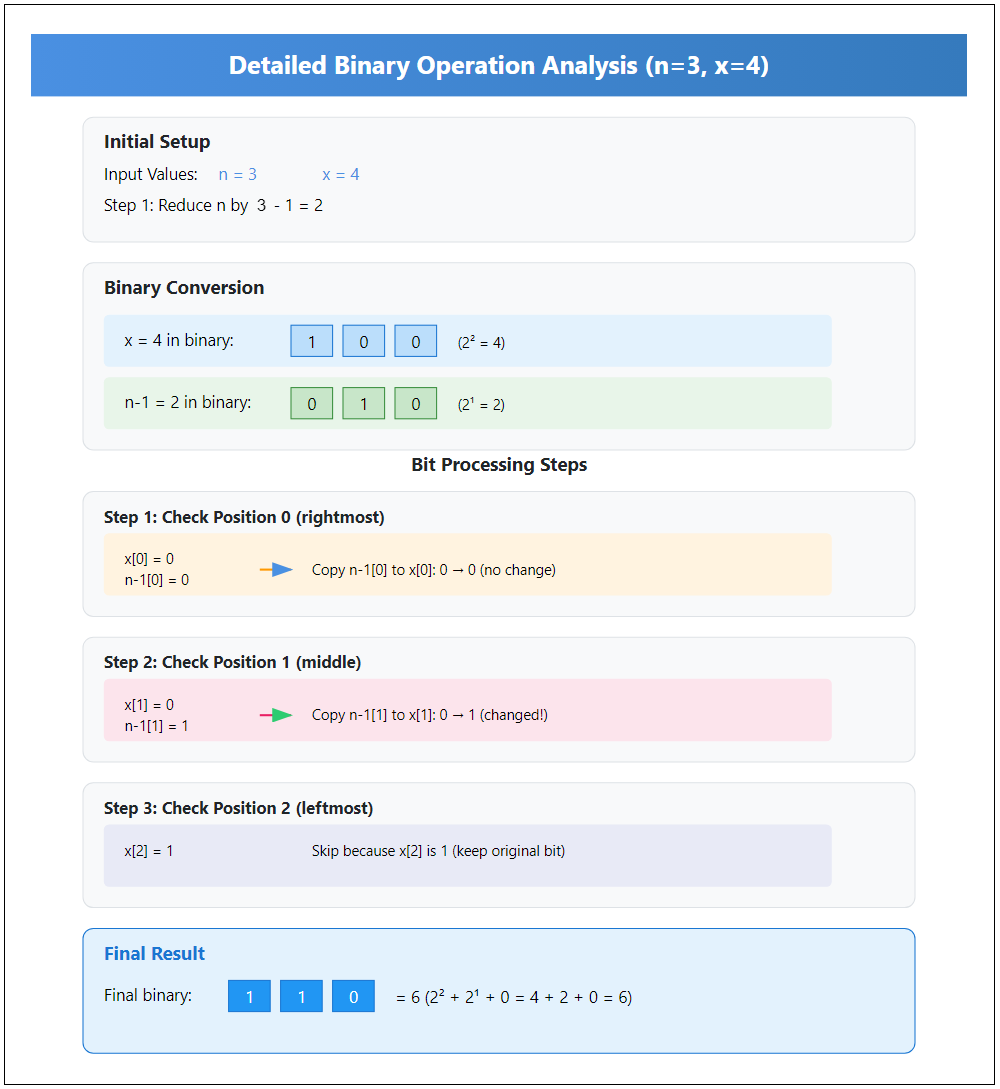 else if (cntLessThanX == 1 && n / cntLessThanX) answer |= ((n / cntLessThanX) - 1 << len);